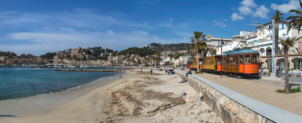 Kurz nach der Ankunft bei fast 20°C und Sonnenschein am Strand von Port de Sóller - hier fährt gerade die historische Straßenbahn Richtung Sóller:
