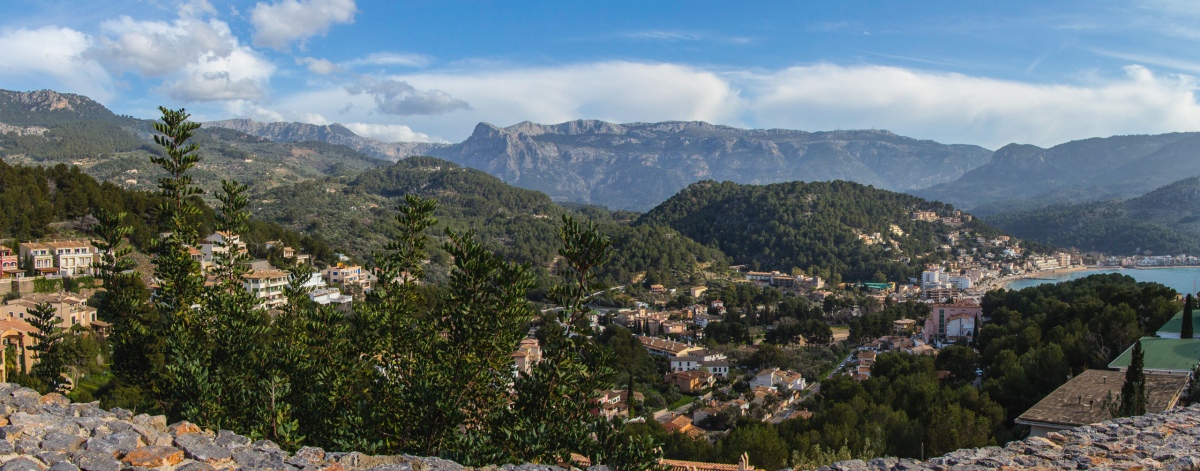 Ausblick über Port de Sóller - hinter den Hügeln im Vordergrund liegt das Tal von Sóller mit der beeindruckenden Wand der Serra d'Alfàbia (rund 1000 m hoch) im Hintergrund: