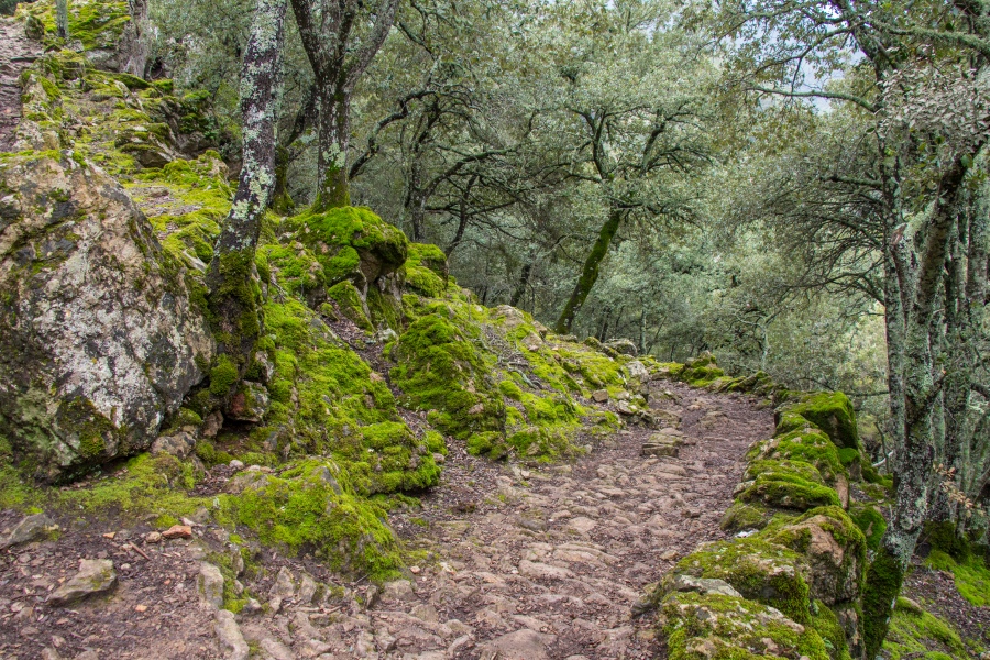 Wunderschöner Weg durch den moosbewachsenen Steineichenwald nahe des Klosters Lluc: