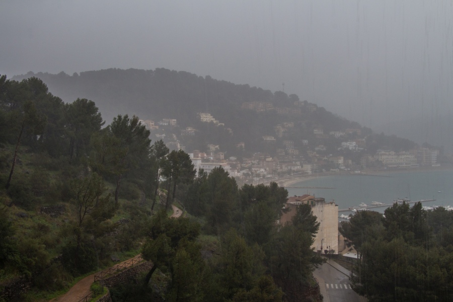 Heftiger Regen - Blick aus dem Hotelzimmer auf die Bucht von Port de Sóller: