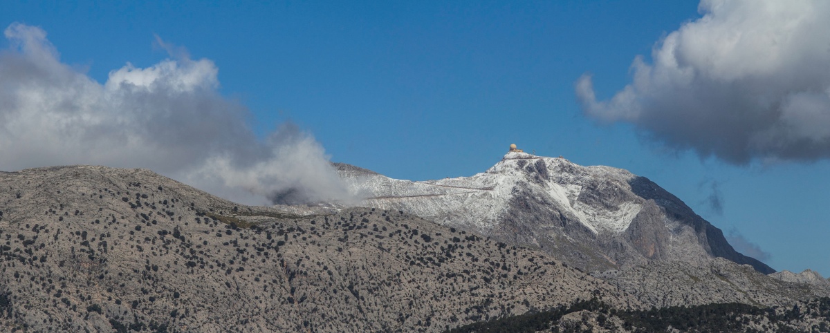Vom Alaró bot sich ein toller Blick auf den höchsten Berg Mallorcas, den 1436 m hohen Puig Major - nun sogar mit frischem Schnee vom Vortag überzuckert: